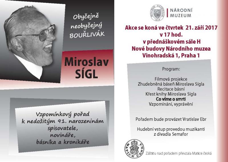 Dovolujeme si vás pozvat na vzpomínkový pořad k nedožitým 91. narozeninám spisovatele, novináře, básníka a kronikáře Miroslava Sígla, spojený
